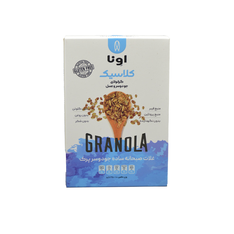گرانولا کلاسیک اونا طعم جو دوسر و عسل سری K بدون گلوتن ۲۵۰ گرمی